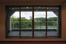 池を庭の一部のように取り込んだリビングの窓